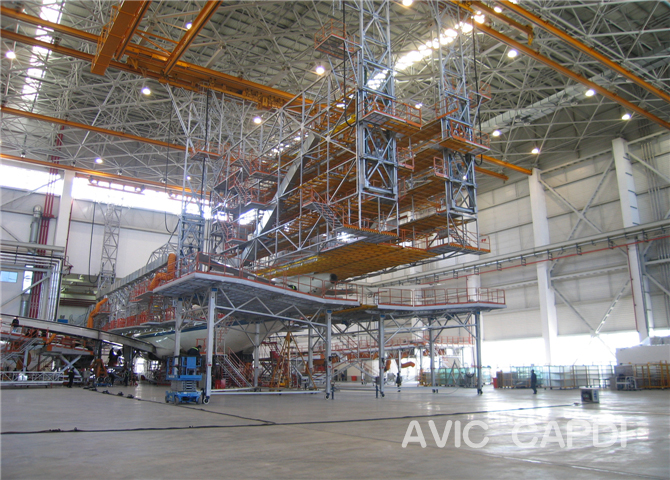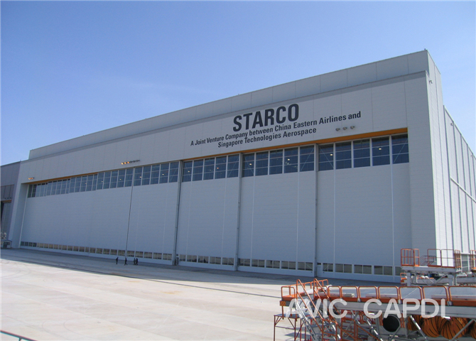 Spécifications: 156.8m×105m×29.5m (travée, profondeur, hauteur de membrure inférieure) Niveau de maintenance: Remise en état, peinture Surface construite: 26,120 m2 Superficie occupée:16,750 m2 Investissement: 260 millions de yuans Date d'achèvement: 2009 Traits caractéristiques: Capable de recevoir deux B747-400 (nez de